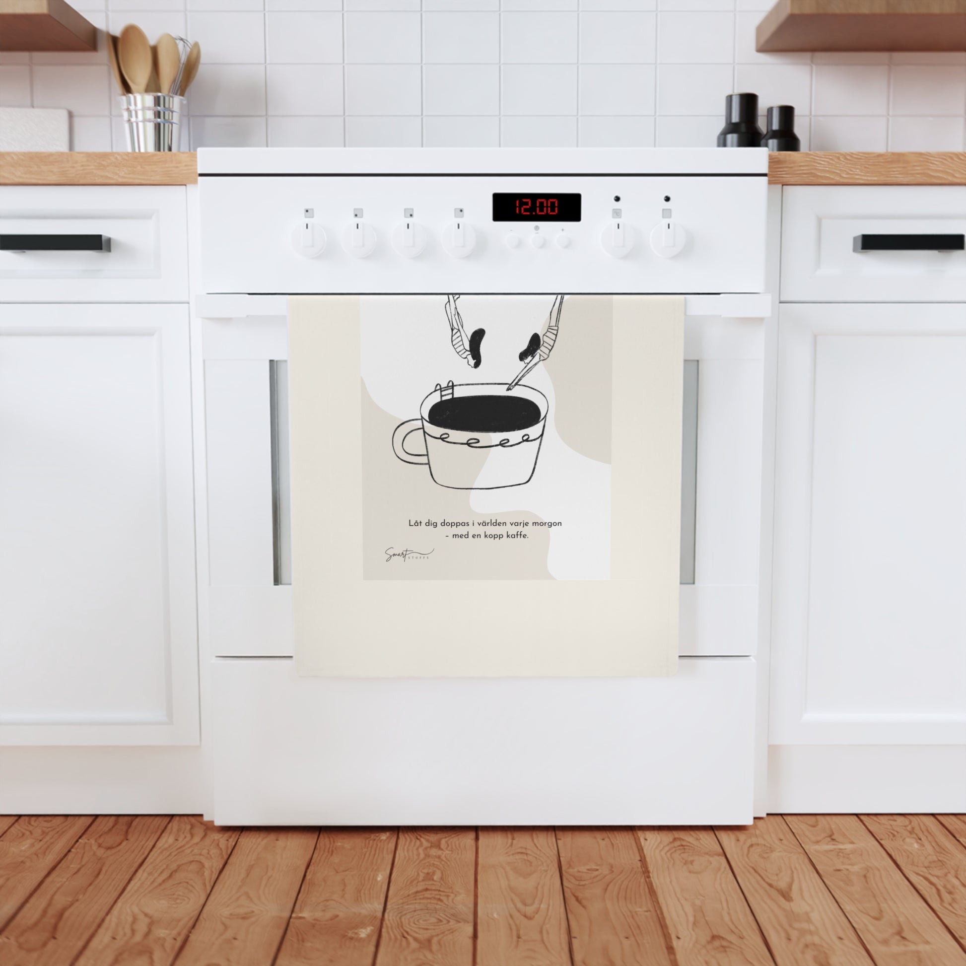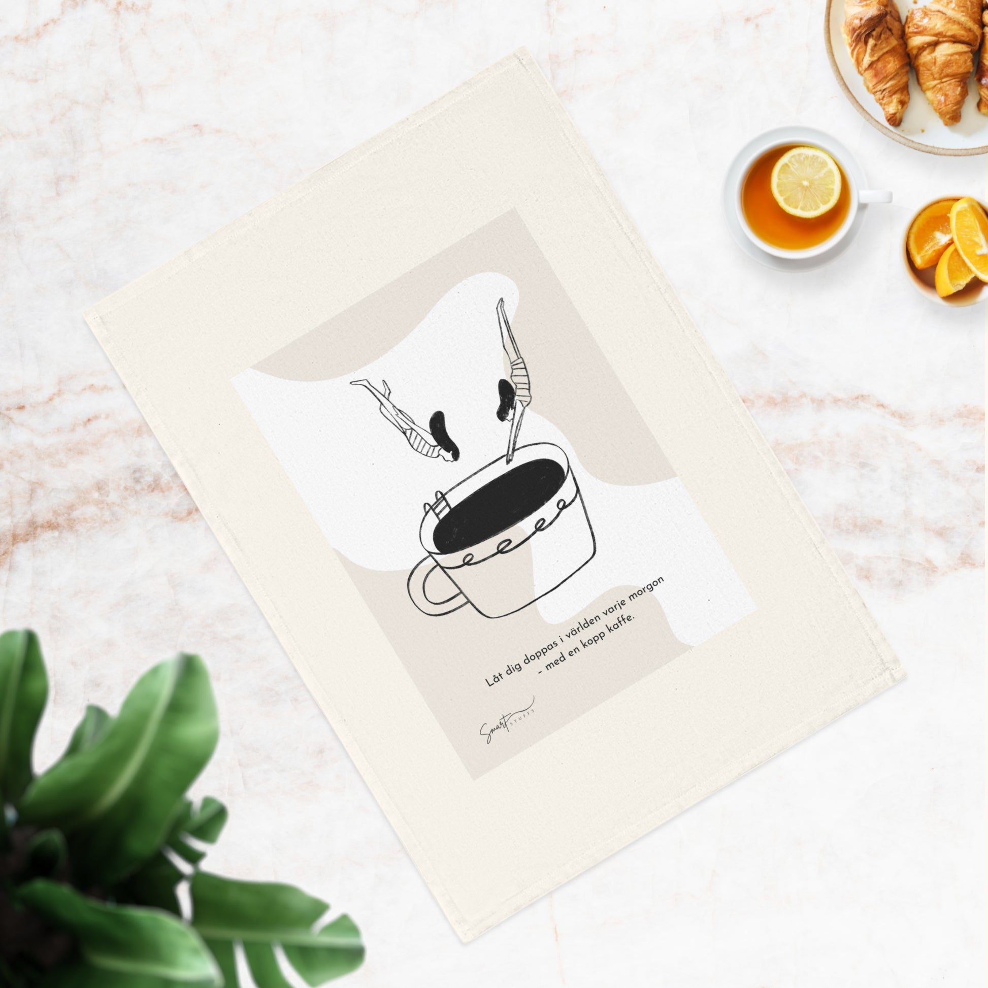 En mjuk, andningsbar kökskamrat tillverkad av 100 % ekologisk bomull och tryckt med en lekfull kaffebild. Handdukens absorbenta väv tar upp morgondroppar och torkar snabbt mellan användningarna.