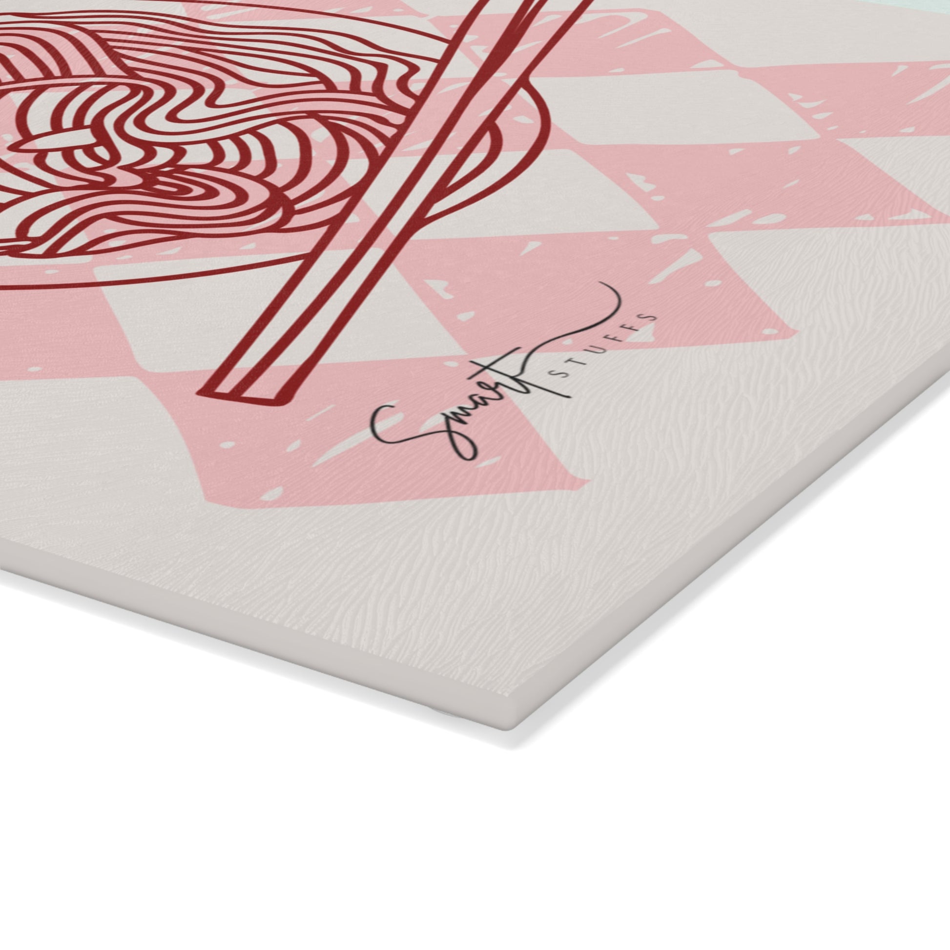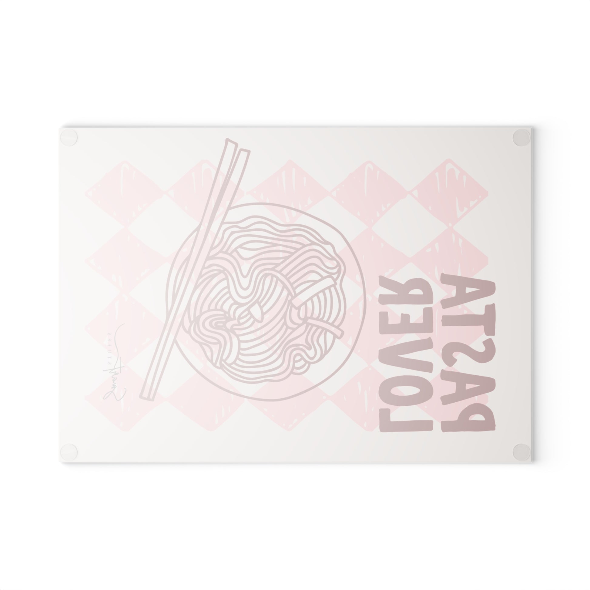 En retro rosa rutig bakgrund ramar in en handritad skål med nudlar och ätpinnar, med fet text som lyder “PASTA LOVER” — en design som känns varm, avslappnad och lite lekfull. Den släta, texturerade glasytan ger ett rent, modernt utseende samtidigt som den motstår fläckar och lukt. Fyra små gummifötter håller brädan stadigt på bänken, så att du kan hacka, skiva eller använda den som ett färgglatt serveringsfat för aptitretare eller efterrätter.