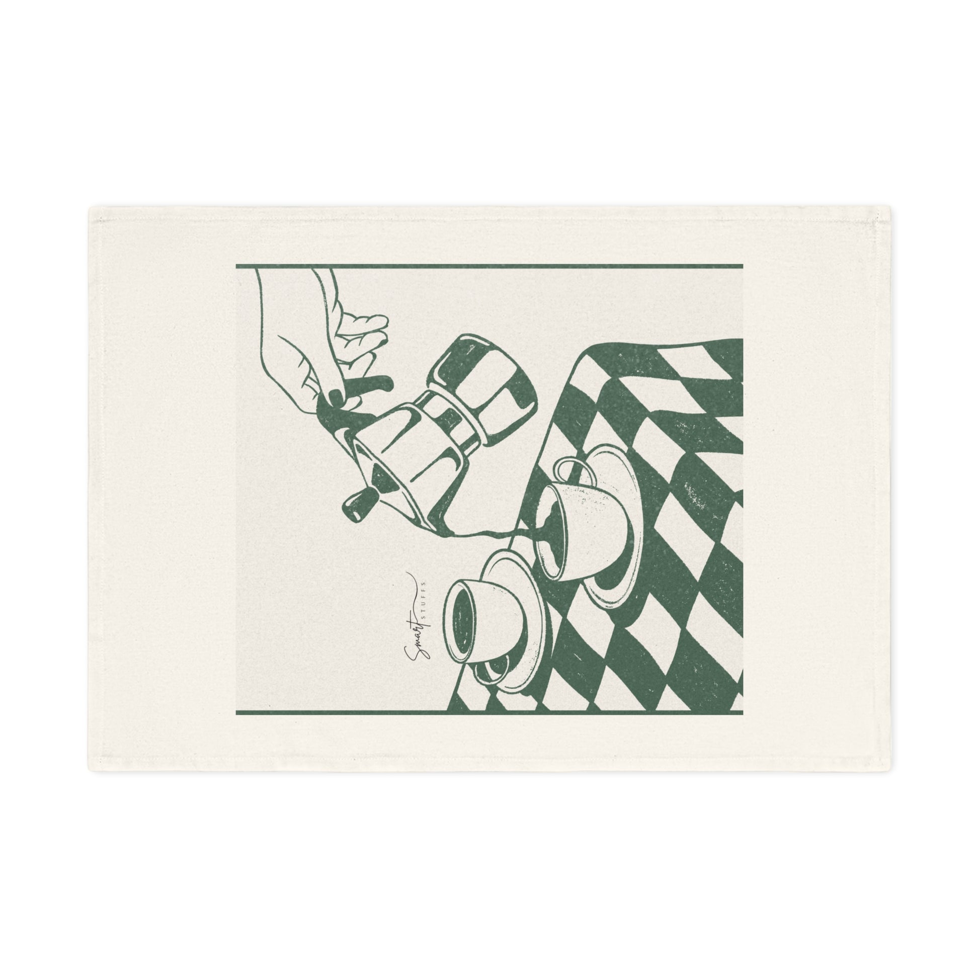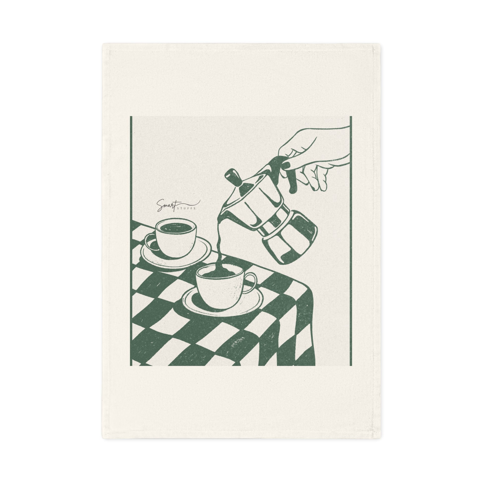 Morgonljus glider över en rutig bordsduk. En stadig hand lutar en mokabryggare, och mörkt kaffe rinner ner i väntande koppar. Denna handduk av 100% ekologisk bomull förmedlar den tysta, vardagliga ritualen—värme, lugn och lite italiensk cafécharm—återgiven i en enkel, vintageinspirerad illustration.