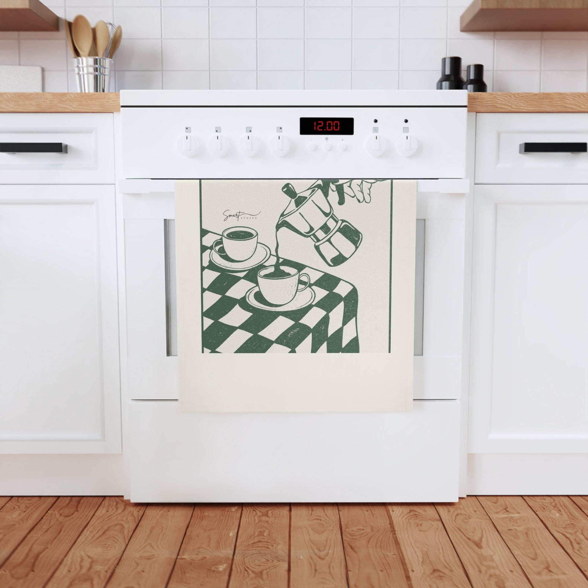 Lätt och absorberande, den kan ligga på köksbänken eller hängas vid spisen, redo för snabba uppstädningar och för att ge en levande, konstnärlig känsla till vardagsmorgnar. Trycket på ena sidan håller baksidan plain och naturligt strukturerad, så att den känns mjuk i händerna och ser ut som om den hör hemma i ett mysigt kök som värdesätter långsamma morgnar och gott kaffe.